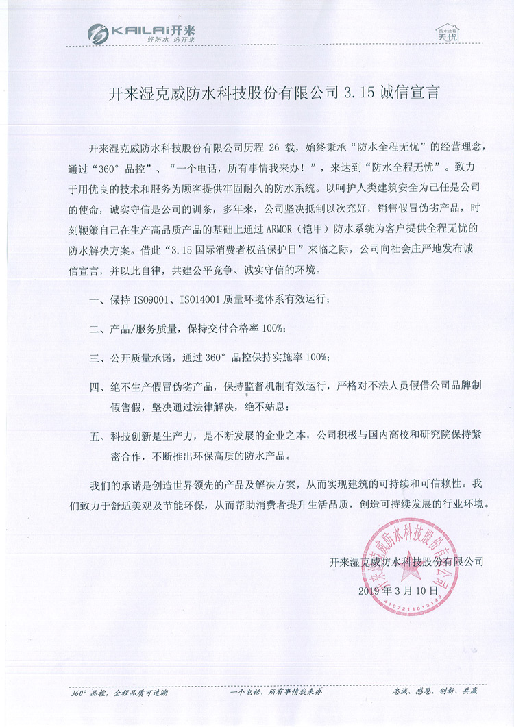 開來濕克威防水科技股份有限公司歷程26載,始終秉承“防水全程無憂”的經(jīng)營理念,通過“360°品控”、“一個電話,所有事情我來辦!”,來達到“防水全程無憂”。致力于用優(yōu)良的技術(shù)和服務為顧客提供牢固耐久的防水系統(tǒng)。以呵護人類建筑安全為己任是公司的使命,誠實守信是公司的訓條,多年來,公司堅決抵制以次充好,銷售假冒偽劣產(chǎn)品,時刻鞭策自己在生產(chǎn)高品質(zhì)產(chǎn)品的基礎上通過ARMOR(鎧甲)防水系統(tǒng)為客戶提供全程無憂的防水解決方案。借此“3.15國際消費者權(quán)益保護日”來臨之際,公司向社會莊嚴地發(fā)布誠信宣言,并以此自律,共建公平競爭、誠實守信的環(huán)境。