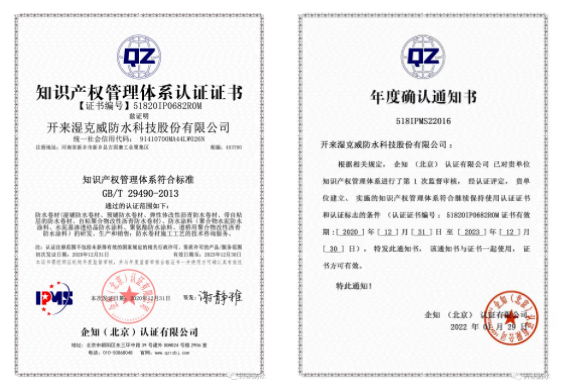 經(jīng)過企知(北京)認證公司的審核,于2020年12月31日獲得《知識產(chǎn)權管理體系認證證書》。2022年1月29日,企知(北京)認證公司對該體系又做了復審,并頒發(fā)了《年度確認通知書》,該證書的獲得,標志著開來濕克威防水科技股份有限公司向知識化、數(shù)字化發(fā)展的方向上又進了一步。