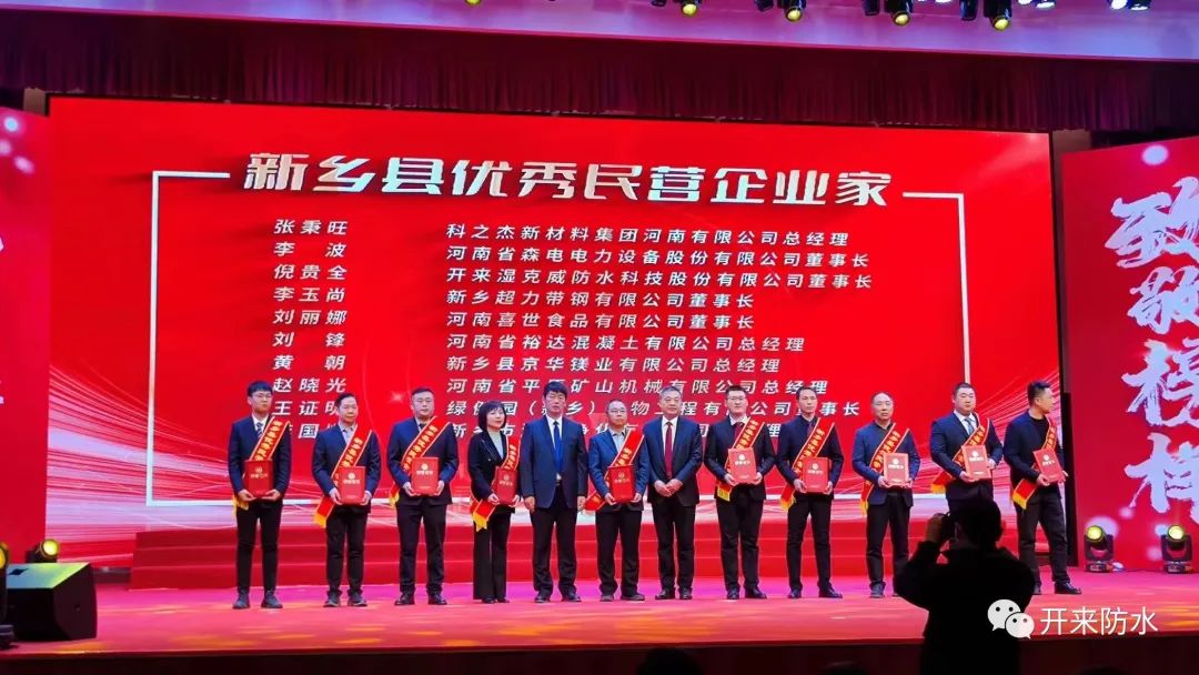 2023年2月4日上午,新鄉縣組織舉辦了《新鄉縣民營經濟高質量發展暨2022年綜合表彰頒獎典禮》大會,會上對全縣的優秀民營企業、優秀民營企業家、先進單位和先進個人進行了表彰和頒獎,開來濕克威防水科技股份有限公司董事長倪貴全先生榮獲優秀民營企業家稱號。